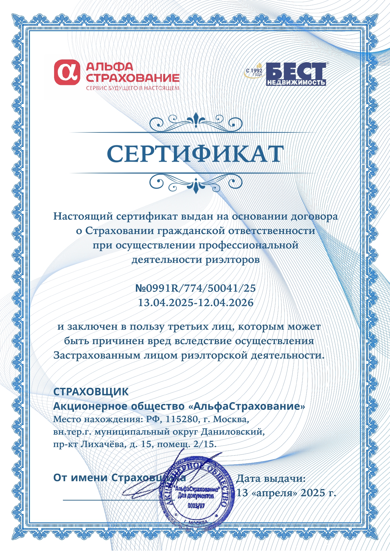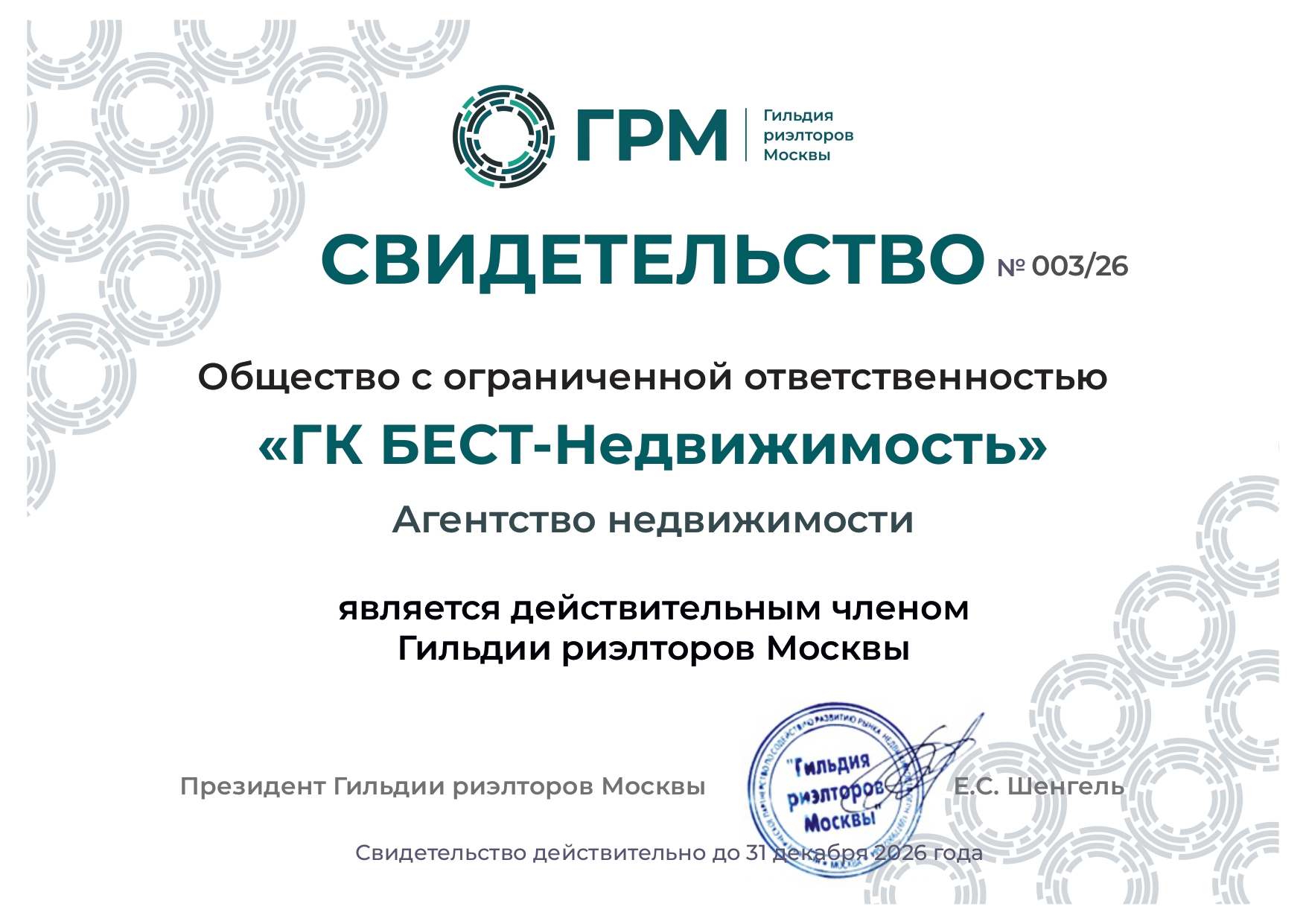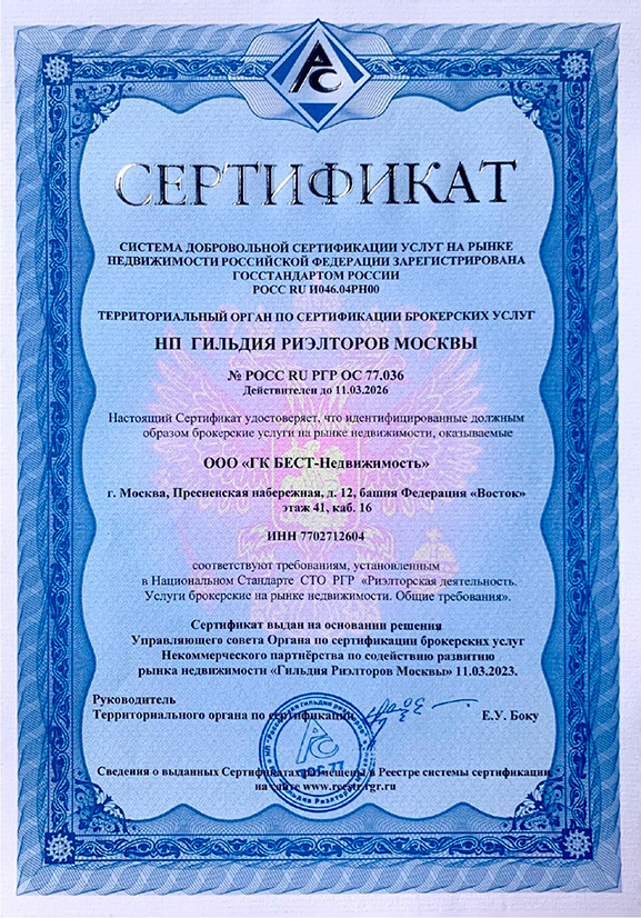 Сертификат соответствия национальному стандарту Российской Гильдии риэлторов
