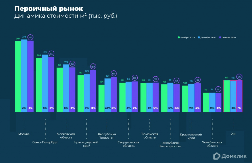 Наибольшее снижение стоимости первичного жилья зафиксировано в Московской области (-6%).